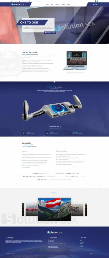 Strona internetowa dla firmy Solution SCA z Warszawy. Główny profil działalności to produkcja inteligentnych wózków sklepowych One to One.