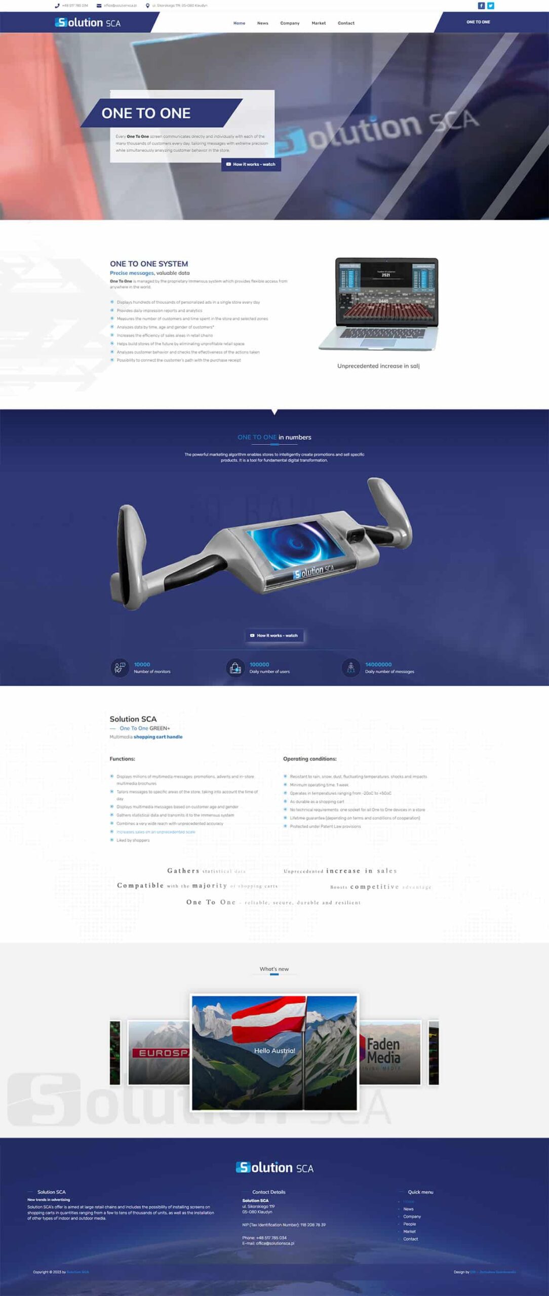 Głównym profilem działalności firmy Solution SCA z siedzibą w Warszawie są inteligentne wózki sklepowe, a dokładnie ekran One To One, który komunikuje się bezpośrednio i indywidualnie z każdym z wielu tysięcy klientów każdego dnia, dopasowując komunikaty z niezwykłą precyzją, jednocześnie analizując zachowania klientów w sklepie.